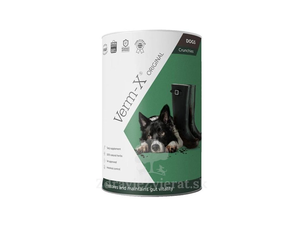 Verm-X® je prírodný produkt pre psov proti črevným parazitom, kontroluje a napomáha k črevnej hygiene a k správnej funkcii čriev, ale zároveň je jemný k tráviacej sústave zvierat. Verm-X® vytvára v črevách a v tráviacej sústave prostredie, s pomocou ktorého sa predchádza rôznym ochoreniam a črevným parazitom. Pravidelným podávaním produktu Verm-X® bude prostredie v tráviacej sústave neustále udržiavané a bude vytvárať neustálu ochranu. Na rozdiel od iných farmaceutických prípravkov, ktoré pôsobia až príliš agresívnym očisťovacím efektom, Verm-X® je veľmi jemný.